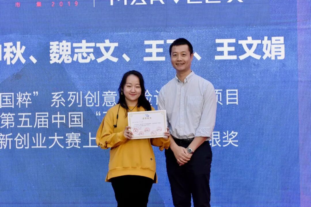 仪式上,还颁发了一个特别的奖项“2019年文创大使”,这个奖项的获得者上海经致文化发展中心创始人马青先生也是学校校友,他毕业于九十年代华山分部的装潢专业,也就是现在的平面设计专业。毕业后他考入东华大学,选择了现代造型专业,2013年,与朋友一起创业,现在,该企业由创业初的10人到现在的200人的团队,逐渐发展成为一家“有国有企业的政治觉悟,有外企的速度,有民营企业的情怀”的文化创意品牌公司,并成为上海本土文化品牌的代表之一。今年,他们参与设计了第22届电影节的海报,借用“大闹天宫”美猴王的形象,致敬了广大幕后电影工作者的创造精神。它说明,好的文创产品已经成为了这个时代最最靓丽的名片。逸夫职校党委书记、校长沈蓝女士向马青先生颁发了奖状,她说“华山艺术馆自开馆一年多来举办的每次展览都不同寻常,不仅追求学术的意义,更努力贴近时势,亲近市场,传导他在教育人文上的温度。当文创、市集的标签随处张贴的时候,我们今天的活动,必须要向那些可贵而不贵的原创作品致敬,为国货风潮的到来呐喊,也为代际传递的文创人才鼓鼓劲,我们学生的逸想秀品牌更要继续加油。前进的路上,有马青先生这样的学长为我们指引方向,保驾护航。逸夫也将继续深化对接校友资源,深化学校和企业市场的合作,文创行业的明天一定会越来越好”。