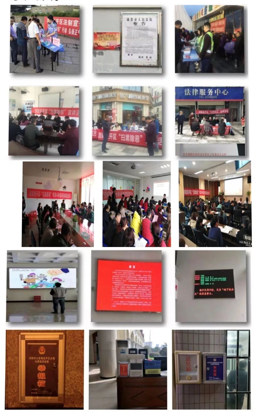 综合运用如:悬挂横幅、张贴通告、标语、LED屏等方式进行“五进”宣传。同时通过向社会公布举报电话、设立举报邮箱等方式,发动群众积极举报涉黑涉恶线索。截至目前,共悬挂横幅177条,LED屏宣传64处;出动宣传车52次;张贴海报300余份,发放宣传单52458份;召开“扫黑除恶”专题宣讲会110余场;张贴“两院”《通告》300余份;设立扫黑除恶举报信箱3个。