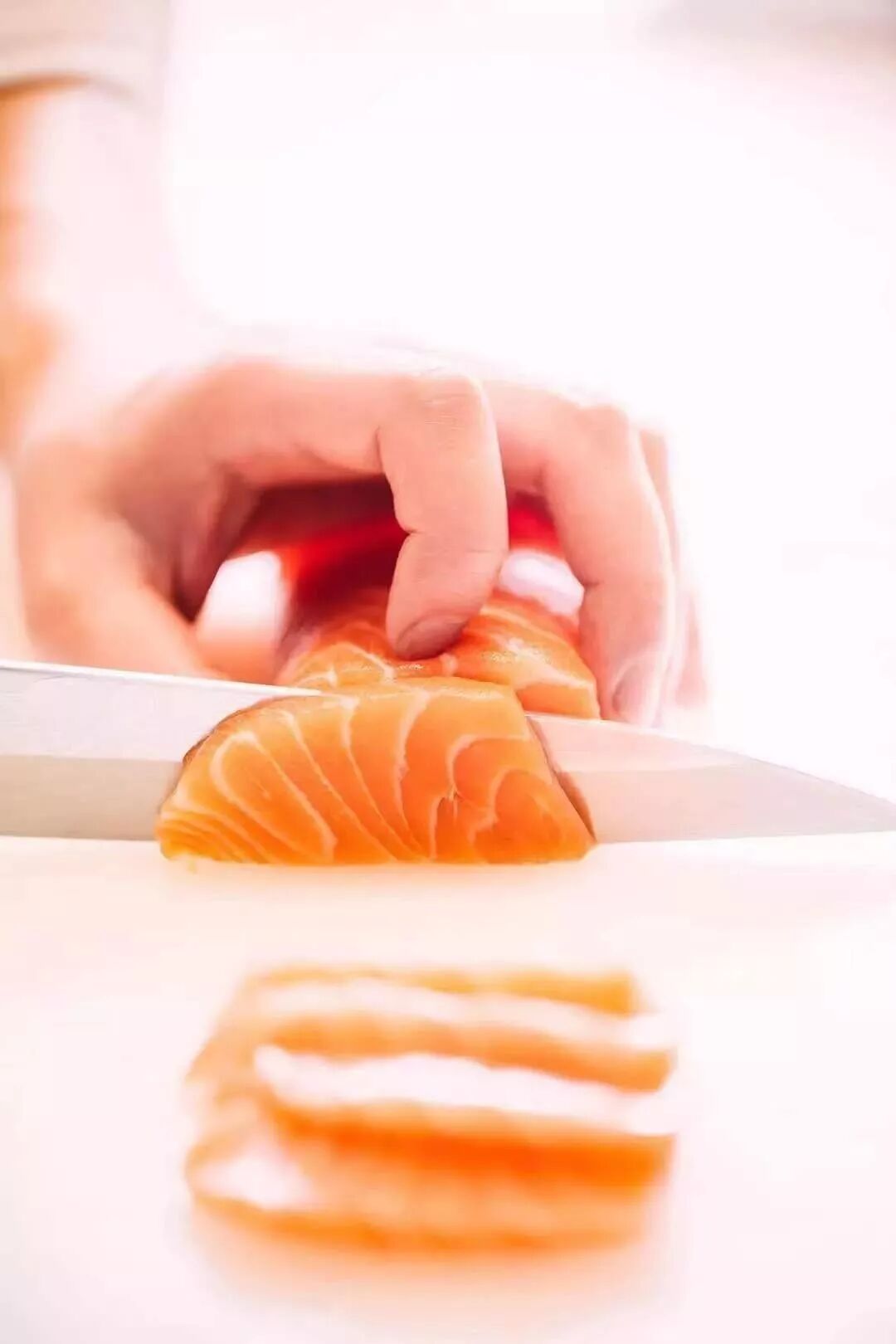 品质出众的三文鱼,日本进口专用刀切割,刀锋快而利,恰到好处的保留了三文鱼原有的形态和纤维组织。