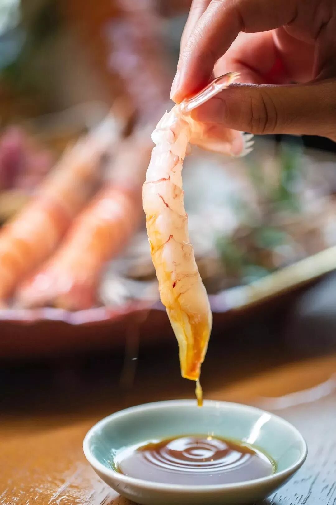 一整颗鲜虾环抱着小胖子醋米饭团,塌泻而下的嫩白身躯,像极了在海岸栖息的英俊少年,一定要含酱一口吃下,才能get到它独树一帜的口感。