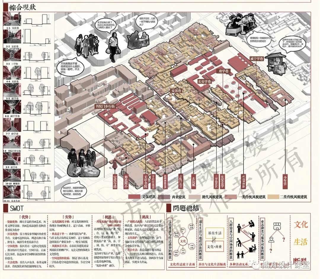 第一张是前期分析板块:从宏观到微观,从外部到内部,从物质空间到人群需求。第二张是策略板块:首先有一个理念生成的逻辑梳理,其次才是四个策略板块,然后最后有街巷展示图进行一个版面提升效果的大图。