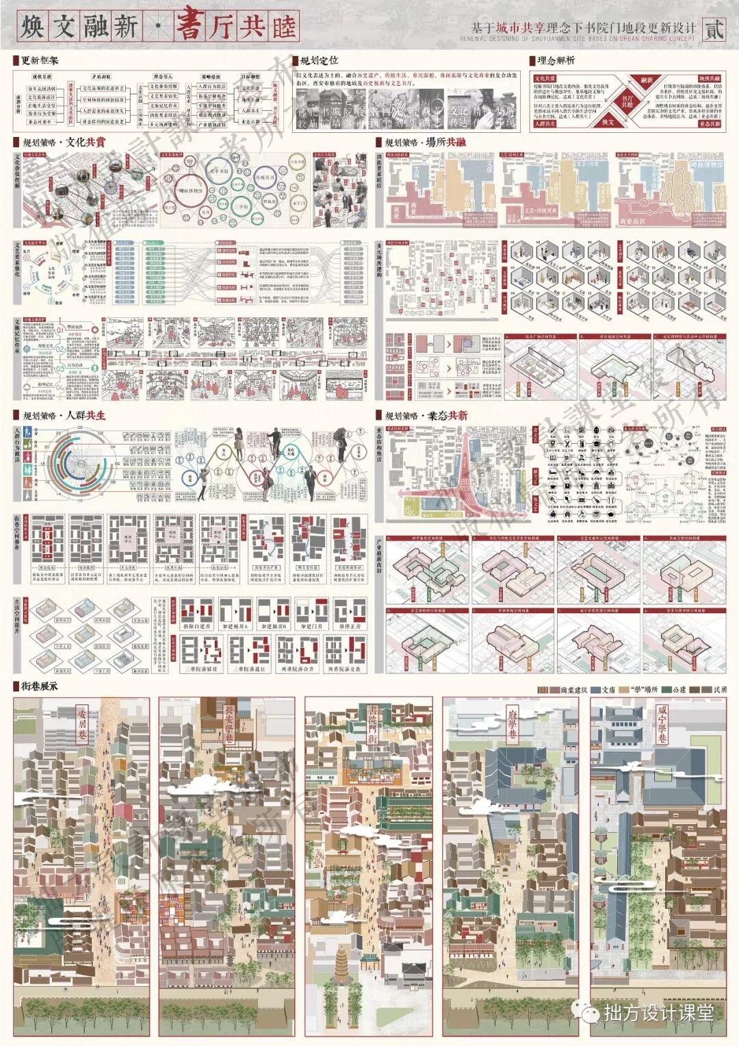 其实就是针对于问题所确定的主要策略——焕文是指挖掘场地内的文化要素,将其文化价值得以显露,并且创造出一系列能够传承文脉的空间。使文化真正的“活”起来。融新则是主要针对于业态方面,进行业态的更新及更替。植入创意产业,增强游客参与感,提高参与度。书厅共睦则是我们的目标与定位。