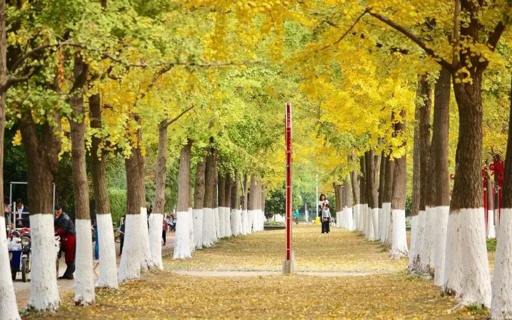 落叶较多的时候,整个银杏林铺满黄色的银杏叶,像一张天然的地毯,令人陶醉不已。
