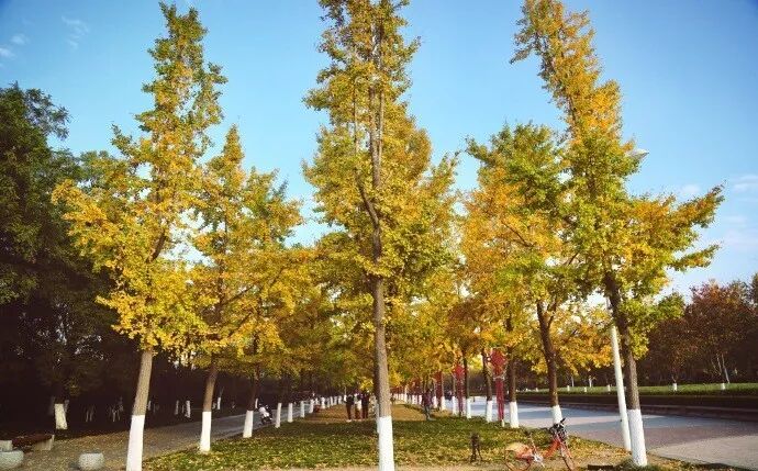 南大银杏树大多分布在北大楼到博物馆的路的两边,还有一片在东边围墙附近,高大的树枝一直探出学校的栅栏外。从小粉桥走过时,能远远地看见一排金黄树叶。