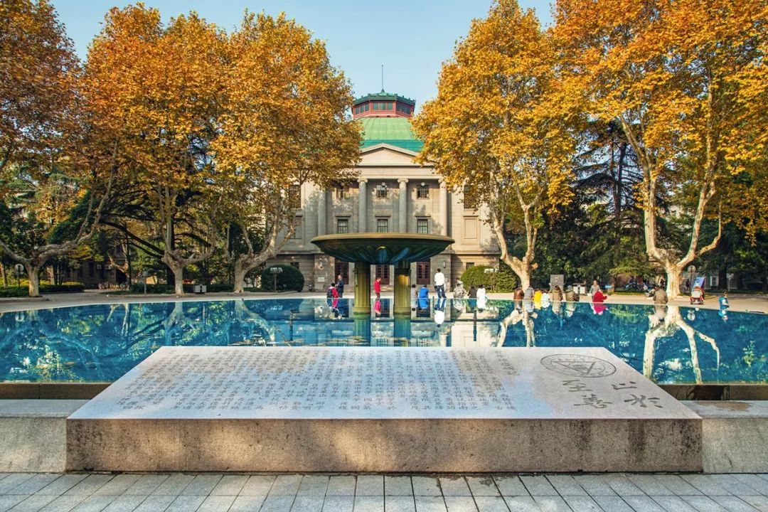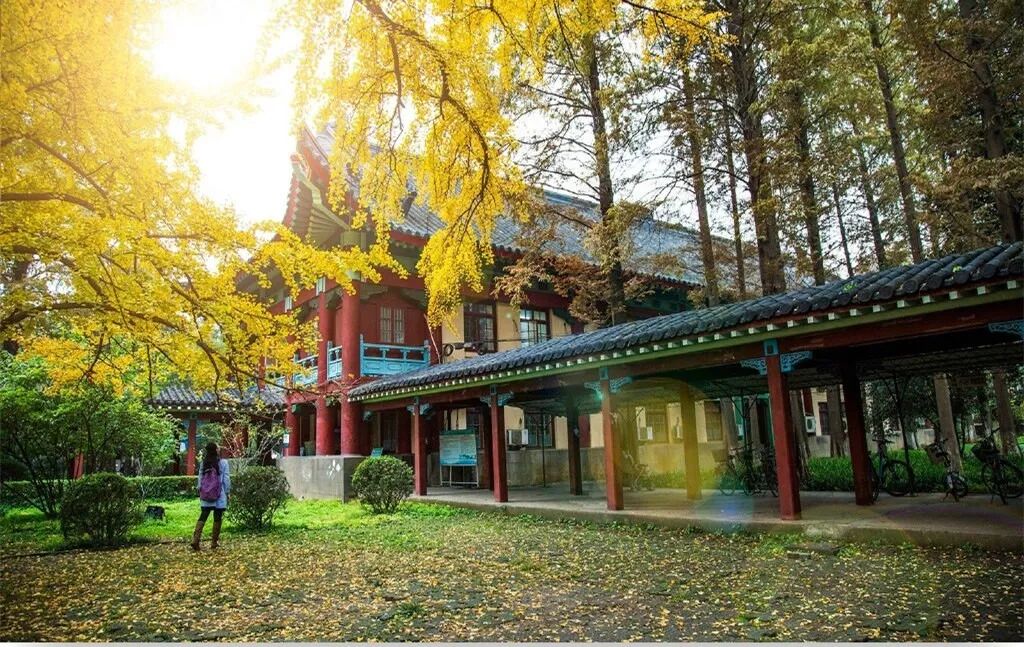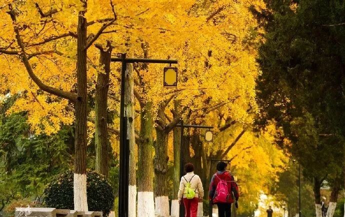 这里是东方最美校园,两株金黄的银杏树已有上百岁,银杏正盛时更显金陵城。