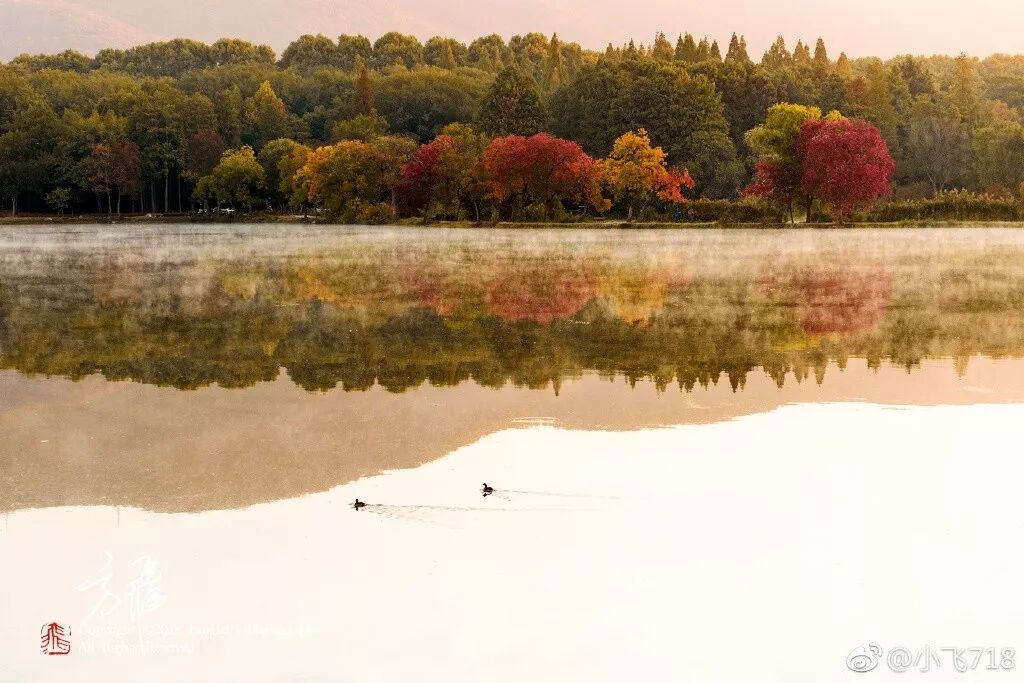前湖边的几颗乌桕树、榉树算是南京秋色好看的消息树,红红黄黄的树干与水中倒影交相辉映,日光下像是一副秋色印象画。