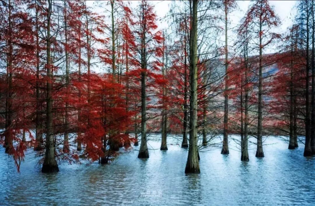 池杉置于水中,青山印在湖里。胡杨树、栗树、山槐、沙松漫山遍野,偶有各种飞禽出没其间,一派原始风光。