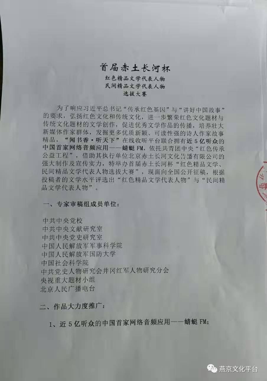 为进一步繁荣我国民间传统文化题材,包括红色题材的文学创作,促进优秀文学作品的传播,培养新时代诗人、作家群体,挖掘更多优质文学精品,昭示天下,服务于人民,中国共青团中央指定的“闻书香·听天下”官网在线收听平台,联合有近5亿听众的中国首家网络音频应用超大平台——蜻蜓FM,特举办首届“中国民间精品文学代表人物”、“中国红色精品文学代表人物”选拔活动,现面向全国公开征稿,根据投稿者的文学水平,公平、公正海选出业界代表人物,借助平台的强大优势,让被选出的作品流传天下,让被选出的文学精英名垂千秋!!