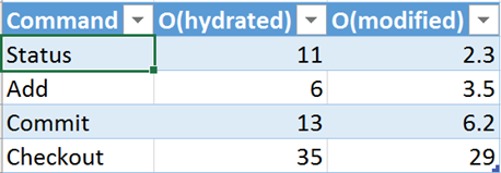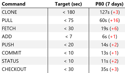 在满意度调查里,有部分工程师对这个系统表示不满。我们有大量数据来解释原因—-从部分工具尚不支持 Git 到学习新知识的沮丧感。但我想深入研究一个首要问题:Git 本身的性能。我们知道当我们推出 Git 时还有很多工作尚未完成,还有很多新东西不断加入。我们跟踪一些Git关键操作的表现。以下是遥测系统从大约 3500 名工程师里收集到的 GVFS 使用数据。