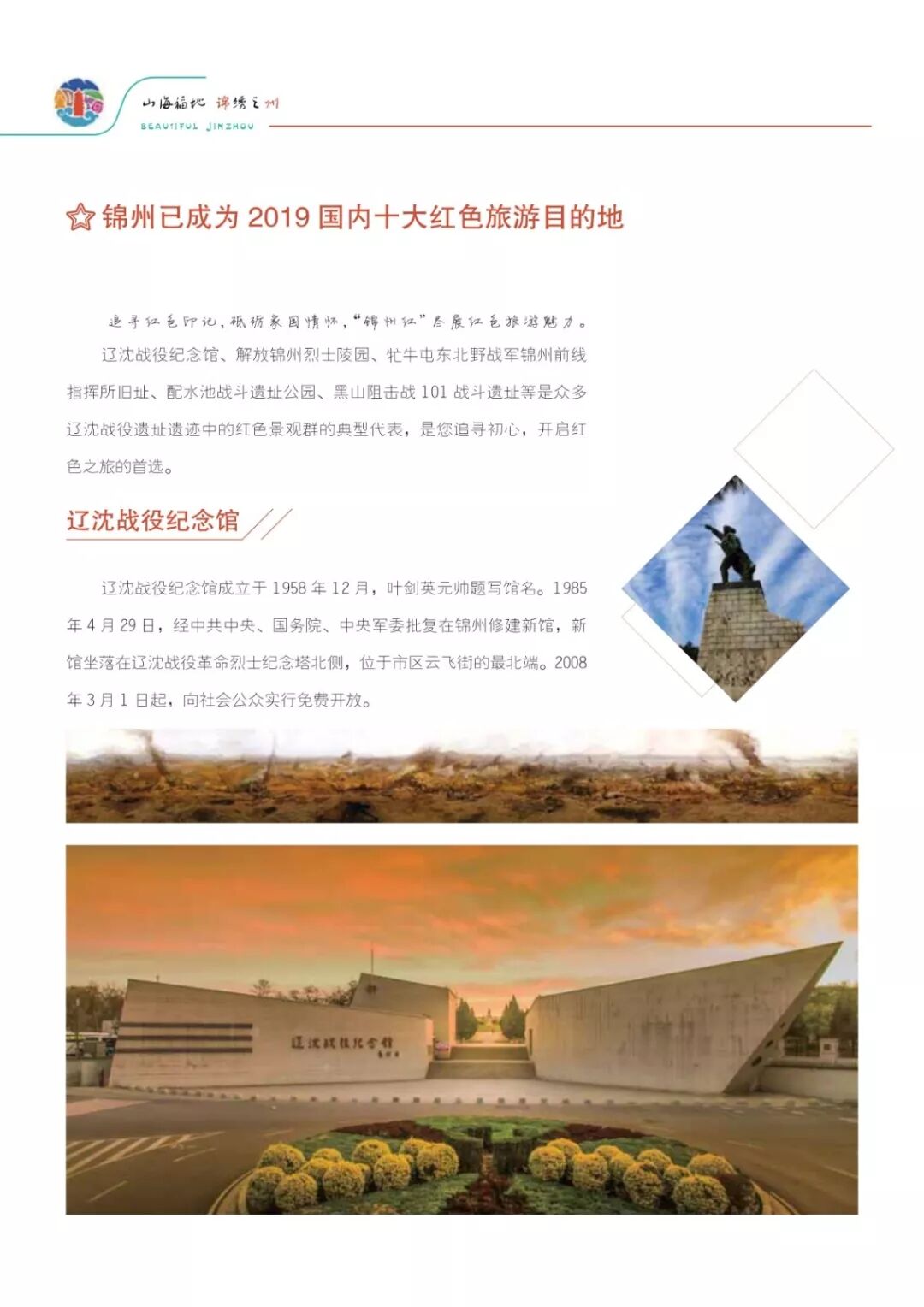 “红色基因世代传承,信念之火生生不息”。今年是中华人民共和国成立70周年,我巿充分利用红色资源,发扬红色传统,传承红色基因,精心设计由辽沈战役纪念馆、解放锦州烈士陵园、牤牛屯东北野战军锦州前线指挥所旧址、配水池战斗遗址组成的辽沈战役遗址“四点一线”红色旅游主题线路,“红色旅游”让锦州“红”遍全国。锦州成功入选马蜂窝2019国内红色旅游目的地TOP10。截至今年第三季度,辽沈战役纪念馆接待游客人数达96.51万人。英雄城市,风景这边独好。这里既有现代都市的快节奏,又有休闲城市的慢生活;这里既有传统文化的优雅从容,又有现代文明的浪漫时尚,兼容并蓄,交相互映。