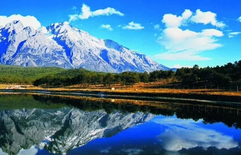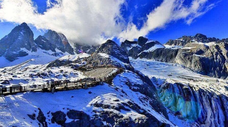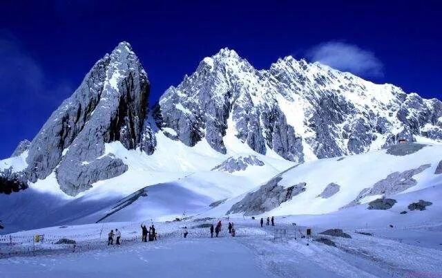 玉龙雪山为云南省丽江市境内雪山群,地处东经100°4′2″-100°16′30″、北纬27°3′2″~27°18′57″之间,在丽江北面约15千米处,全长75千米,是北半球最近赤道终年积雪的山脉,隔江西与中甸雪山、东与绵绵山相并列,北自三江口,向南延伸到北纬27°,如扇面向古城展开。全山的13座山峰由南向北纵向排列,主峰扇子陡最高处海拔5596米,终年积雪,发育有亚欧大陆距离赤道最近的温带海洋性冰川。