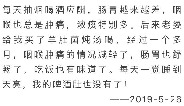 大家都知道酒精对人体的伤害,但几乎没人能保证滴酒不沾,现实生活中无论是聚会还是应酬,都躲不过逃不掉酒桌文化,每天大鱼大肉,高兴了喝多两杯,喝成啤酒肚一身毛病的人真的太多太多了!如果在酒后喝点羊肚菌汤,对肝脏也就多了一层保护,也可以及时的排出毒素!肠道变得更加通畅!许先生,38岁,浙江温州