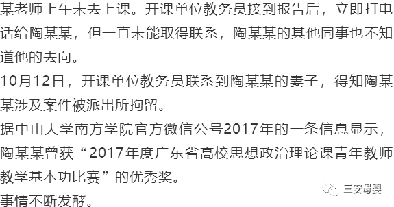 10月14日,中山大学南方学院发布情况通报称,该校教师陶某某在保利桃花源出租房内,因涉嫌强奸女学生被刑事拘留,案件正在侦查中。10月14日,中山大学南方学院发布情况通报。记者注意到,在该通报中,有提到,10月11日,该校学生向辅导员报告陶某