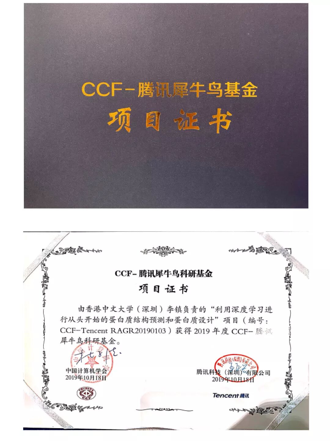 2019年10月17-19日,2019中国计算机大会(CNCC2019)于中国苏州举行。香港中文大学(深圳)理工学院研究助理教授李镇参与的科研项目“利用深度学习进行从头开始的蛋白质结构预测和蛋白质设计”获得了大会颁发2019年CCF-腾讯犀牛鸟科研基金。