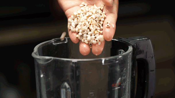 将薏米、大米分别淘洗干净,薏米用温水浸泡1小时,倒入破壁机内,再倒入水开启破壁机(薏米、大米、水的比例大概是1:1:8)