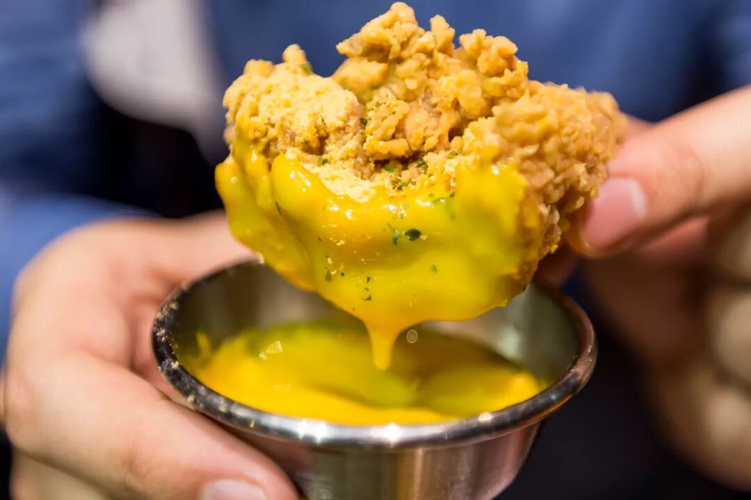 菜品比较有特色,是别的韩料店里没有的。墨鱼芝士饭团是金黄的面衣包裹着墨鱼汁米饭,中间有芝士喝鱼籽,口感非常惊艳。招牌雪冰年糕是杏仁片黄豆面的冰沙配上年糕,再淋上炼乳,口感非常奇妙。