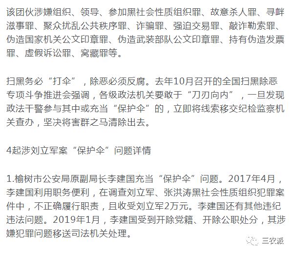 而他们的落马,都与榆树市刘立军黑社会性质组织案有关。根据通知,李建国和锦鑫“释放水”团伙利用他们的职位,如不批准逮捕的人参与了犯罪;严xiaoliang充当“运营商”,要求国际刑警组织旅照顾刘一派,Yu俊威是刘一派,高利贷业务的“平台”。