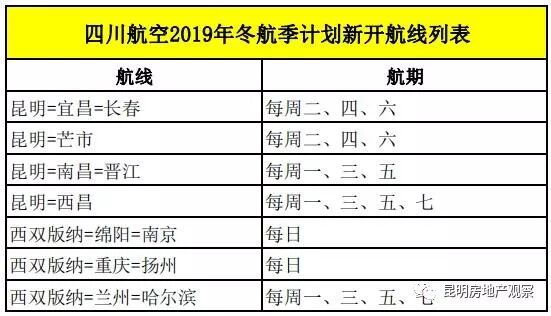 四川航空计划新开昆明=西昌、昆明=芒市、昆明=南昌=晋江、昆明=宜昌=长春、西双版纳=兰州=哈尔滨等航线,并加密昆明=长沙、昆明=杭州等重点航线;