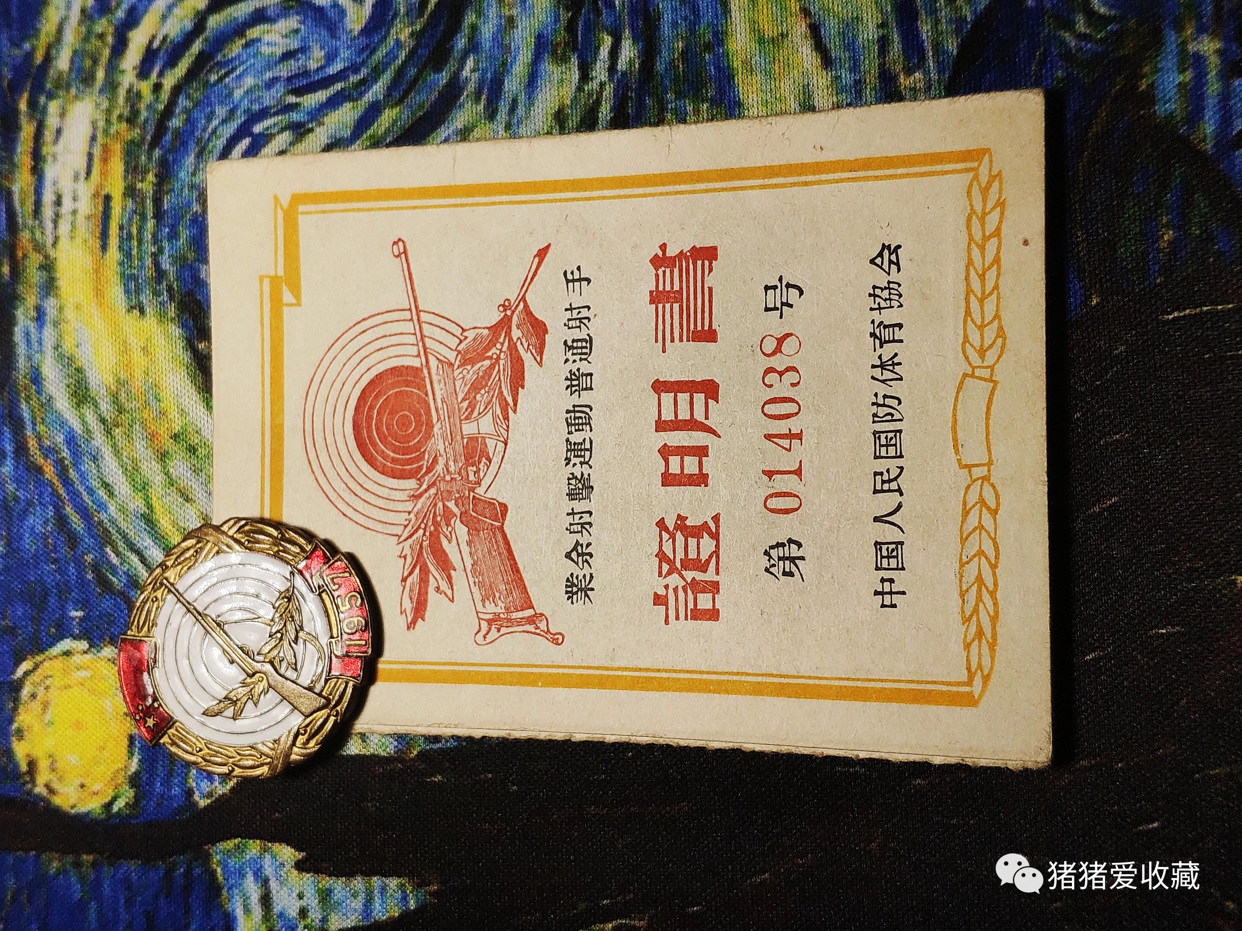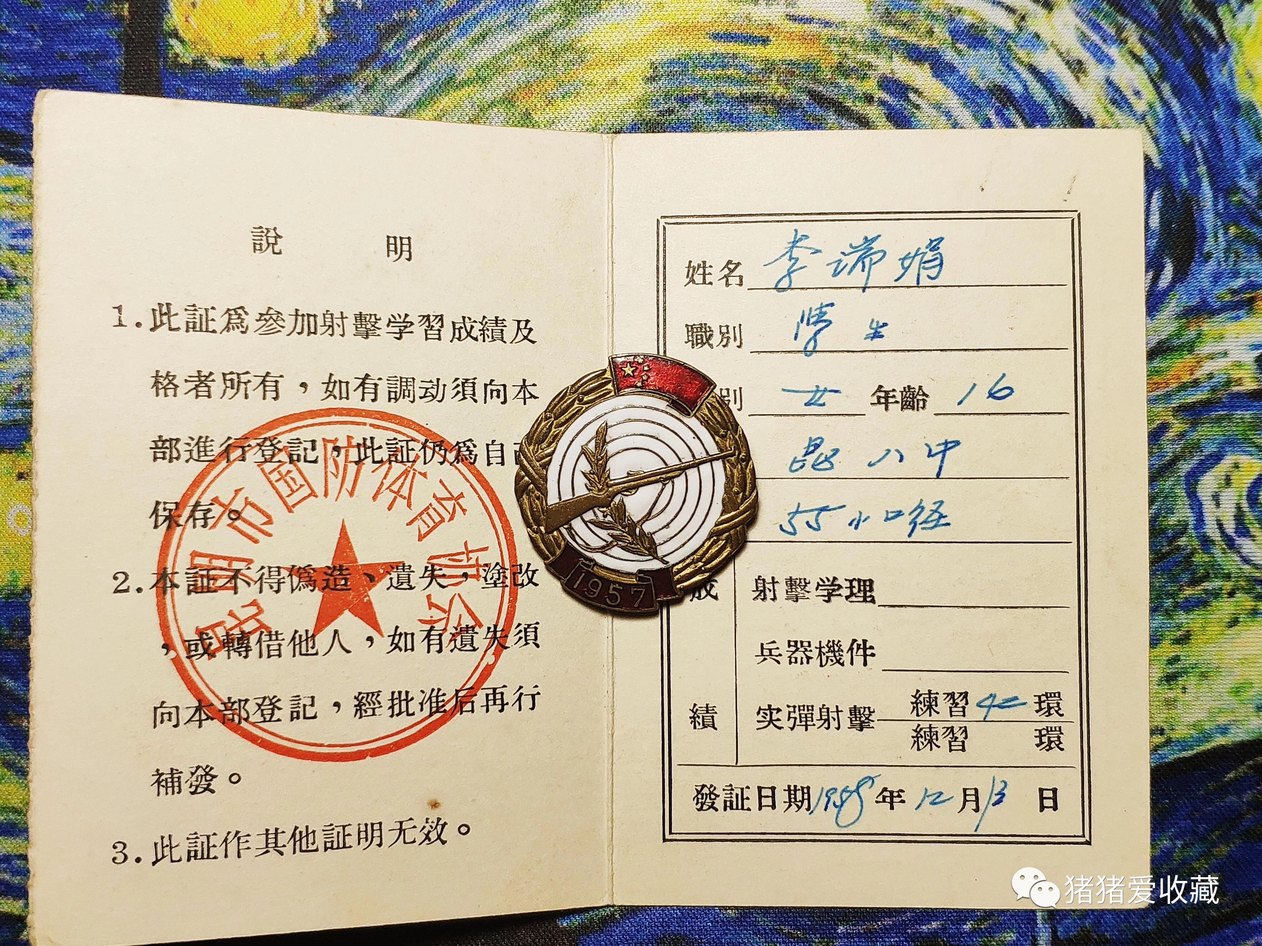 一套昆明女射击运动员的1957年中国人民国防体育俱射击竞赛奖章与射手证明书
