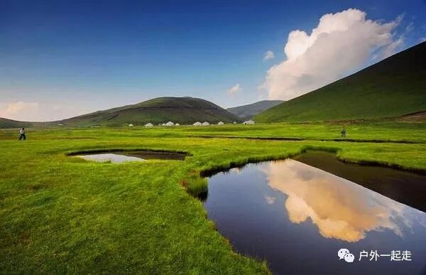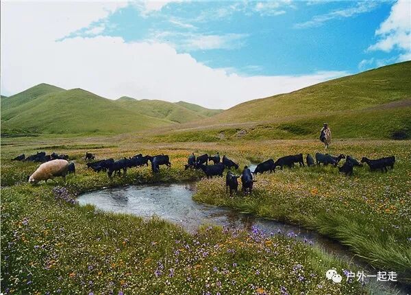 草甸、鲜花、小溪、蓝天、白云、羊群,构成了一幅优美迷人的图画。小溪如带,泉水清澈,绿草茵茵,山花烂漫,形成了硕大的“七彩草场”,在蓝天、白云和点点羊群映衬下,愈显清、幽、雅、洁,静坐于溪旁,白云擦肩而过,徐徐山风吹来,轻抚着脸颊,俨然融入仙境。