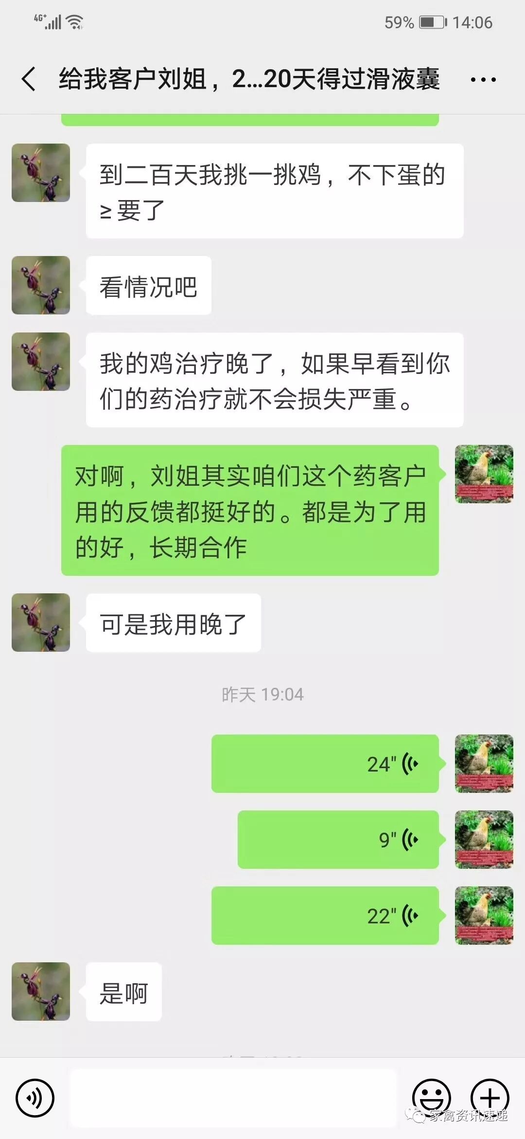 刘姐刚开始用药之前也是犹豫不决,怕治不好耽误病情,毕竟也快开产了, 刘姐按照禽病技术李老师的用法用量来用药3天后刘姐说这个药能强多了,还没有用完呢 ,现在大群精神状态有所好转,采食量恢复正常,而且腿关节肿胀部位也没有那么肿了,用药7天后滑液囊支原体完全治愈。刘姐说道,也有遗憾的地方,鸡虽然治好了,但是治疗的比较晚,如果早看到你们的药就不会造成这么大损失,后又购买2件滑源清做备用,刘姐说非常感谢禽病生物的超浓缩纯中药特效药表示后期长期合作!