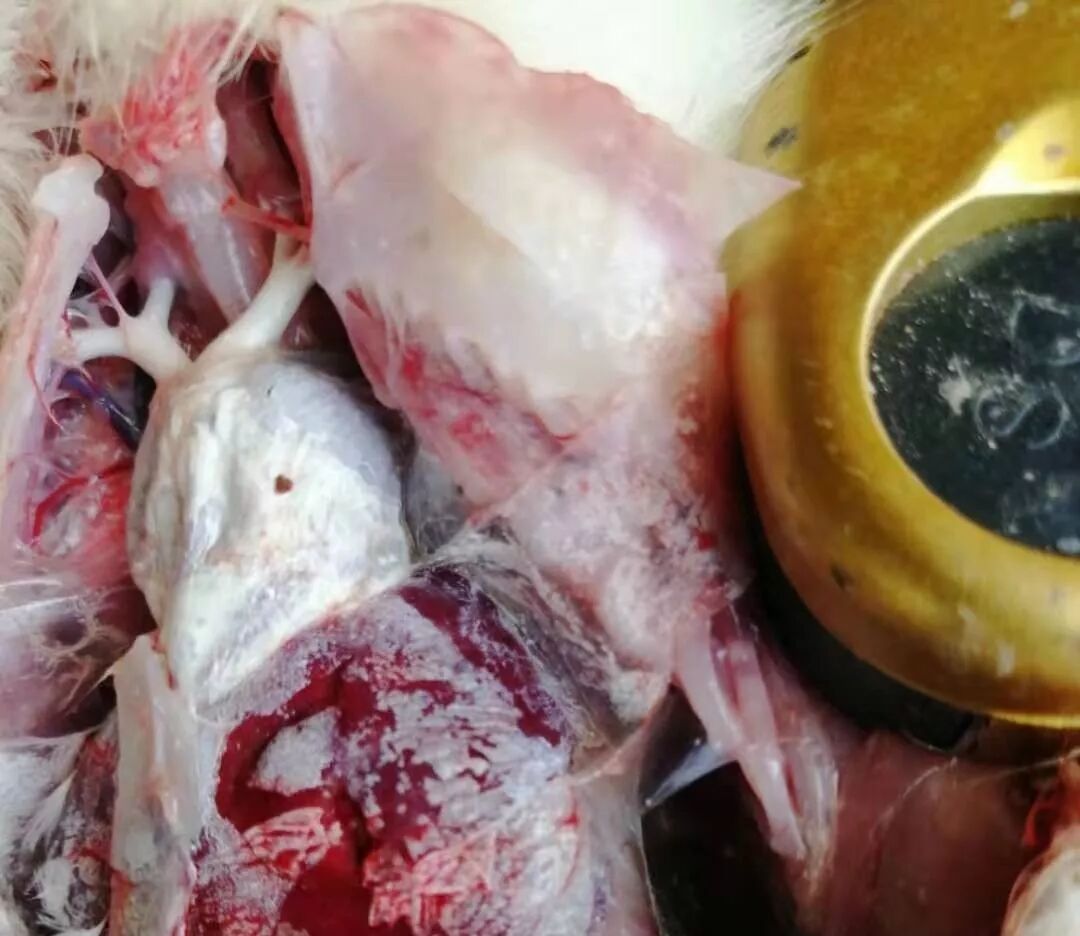 器官,如肝、心、脾、肠系膜及腹膜等表面常有这种石灰样的尿酸盐沉淀物覆