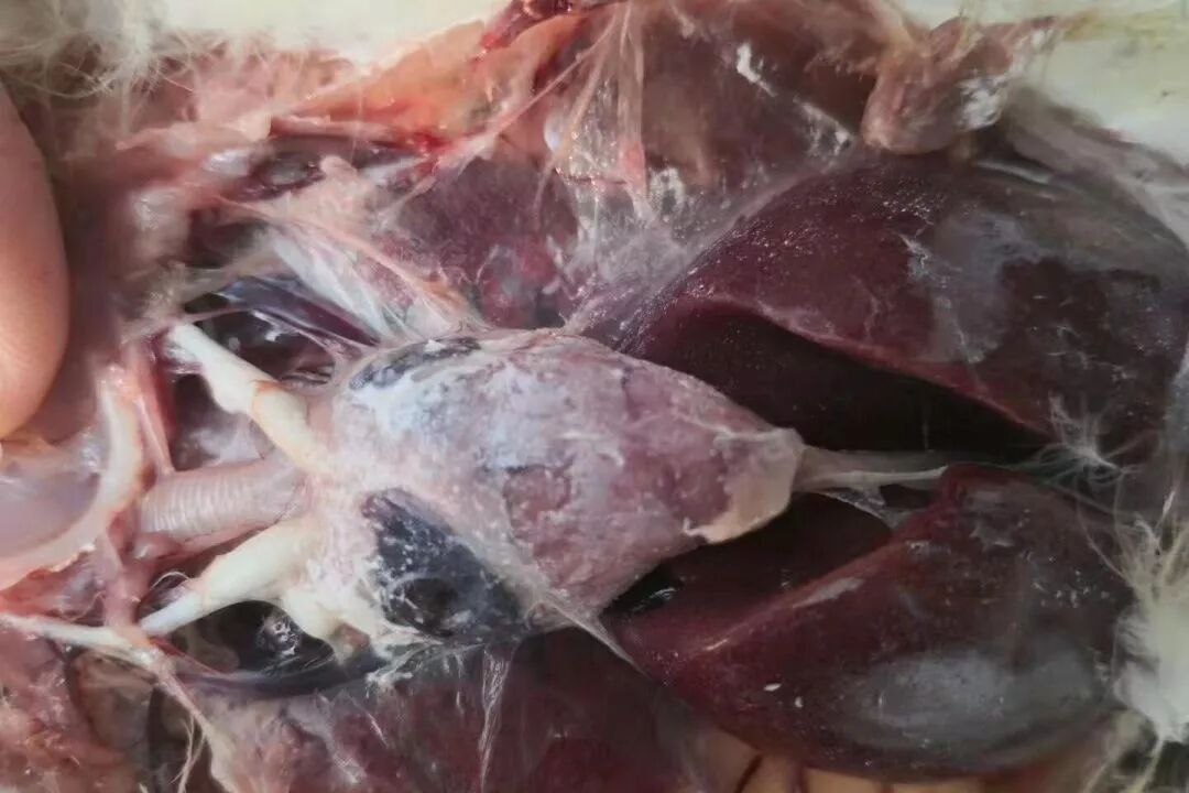 剖检发现,心肝脏出现包膜有结晶体,肝大小不一,肾肿大,花斑状!