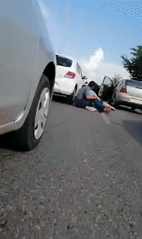 公路上的司机为了躲避机枪扫射,抱着孩子从车上下来,趴在地上保命。有人疯狂倒车,有人逆行,不顾一切只为逃命。