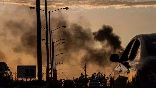 黑烟弥漫在城市上空,一派末日景象,俨然战争爆发