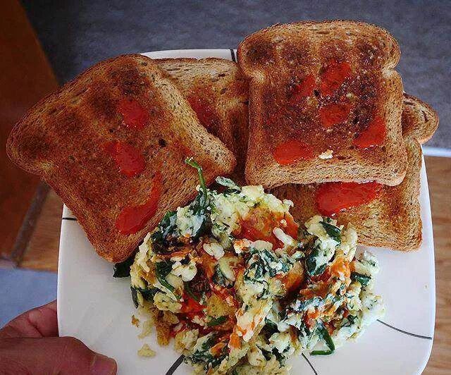 早餐:用鸡蛋炒菠菜,再来4个面包片,撒上一些食言、番茄汁,这样高蛋白的饮食营养俱全,而且热量不高。