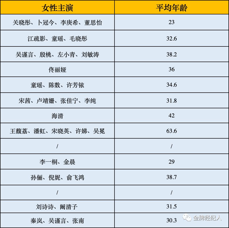 据金牌经纪人(y-agent)统计,在这14部剧中,除去还未透露主演的2部作品,其余12部主要女演员的平均年龄都在30——40岁之间。其中,以20+、40+演员为主的戏各两部,占总数的16.6%;30+的则有八部,占比66.7%,而在这八部中,女演员年龄超35岁的只有三部。