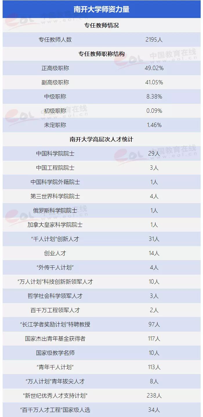 南开大学凝聚了一批具有高水平研究和教学能力的专家学者,其中,中国科学院院士29名、中国工程院院士3名,“长江学者奖励计划”特聘教授97名,“千人计划”创新人才31人。此外还有国家杰出青年基金获得者、国家级教学名师、“百千万人才工程”国家级人选等数百名高层次人才。