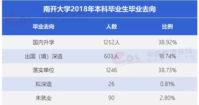 2018年南开大学本科毕业生共计3217人,毕业去向以升学为主,其中国内升学1252人,占本科毕业生总数的38.92%;出国(境)深造603人,占本科毕业生总数的18.74%。另外,签约就业1246人,占比38.73%。