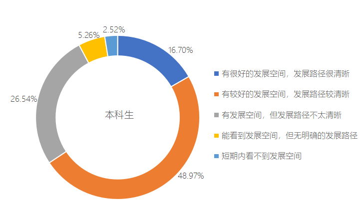 16.70%的本科生表示工作岗位有很好的发展空间,发展路径很清晰;48.97%的本科生表示工作岗位有较好的发展空间,发展路径比较清晰。