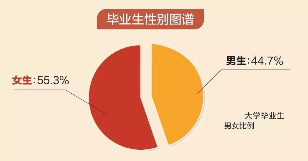 报告显示,我区毕业生女多男少的情况在进一步加深。今年男性毕业人数10.84万人,占毕业生数的44.7%,男性占比较之去年又减少了0.3%;女性毕业人数13.41万人,占毕业生数的55.3%,男女比为1:1.24。相当于每9名毕业生中,有5人是女生,4人是男生。