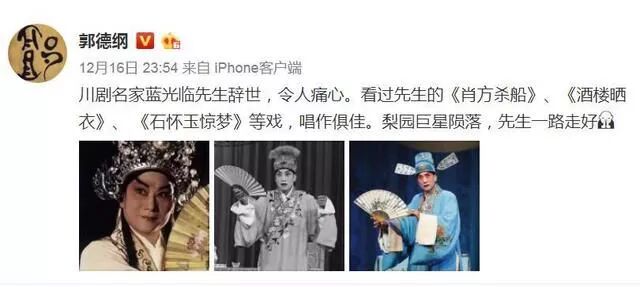 作为曲艺界博学多才的“小学生”,郭德纲也专门通过个人微博对兰光临的去世表示了哀悼,他说“川剧名家蓝光临先生辞世,令人痛心。看过先生的《肖方杀船》、《酒楼晒衣》、《石怀玉惊梦》等戏,唱作俱佳。梨园巨星陨落,先生一路走好”。