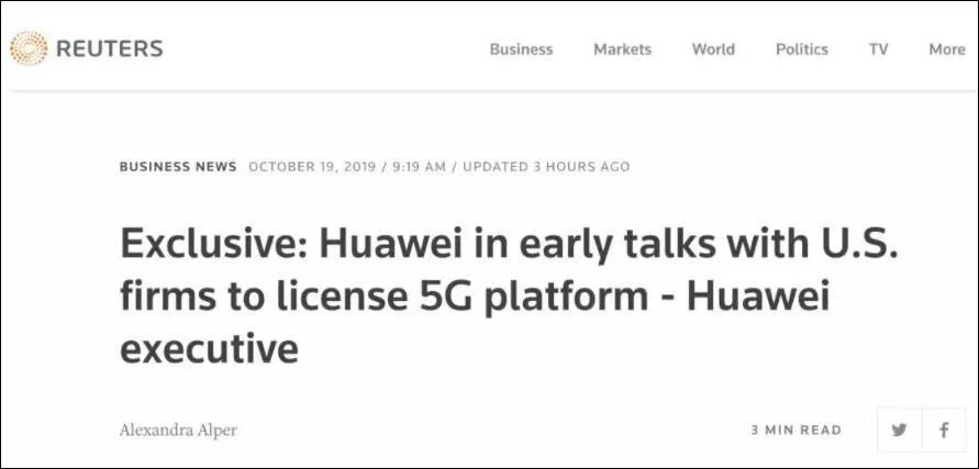 路透社10月19日报道称,华为高级副总裁兼董事彭博在18日透露,目前几家美国公司都对华为的5G技术授权感兴趣,正在和华为进行早期谈判。不过华为方面没有透露这几家美国公司的名称。
