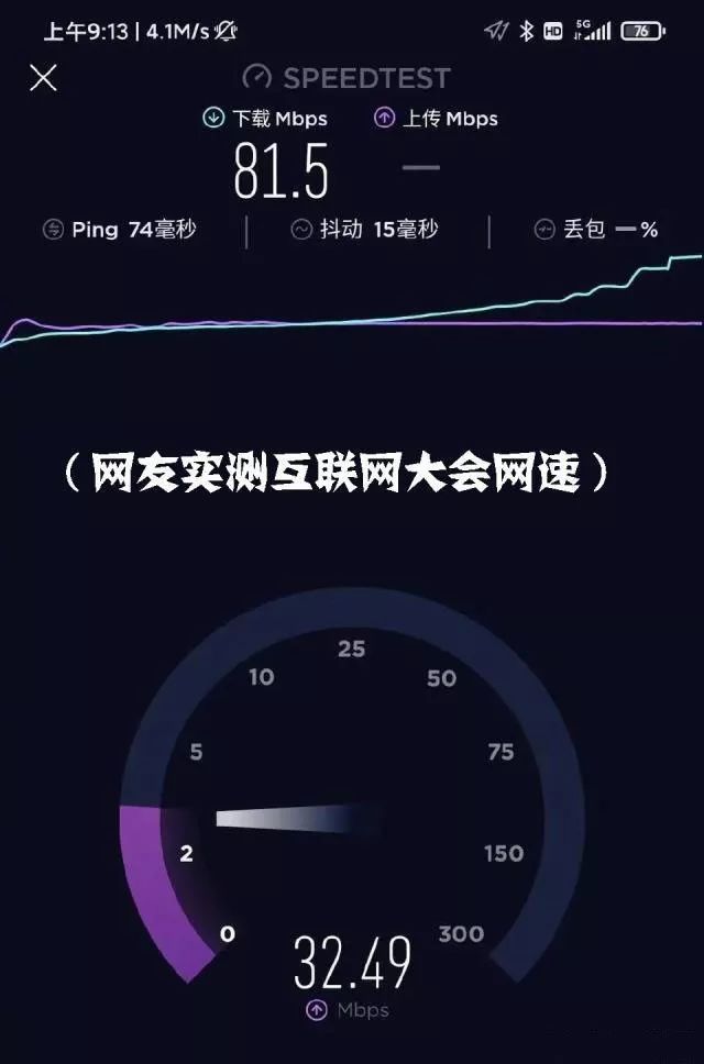 大会现场雷军发出互联网上大会的5G连网速度,下行速度是81.5M,上行速度是32.49M。