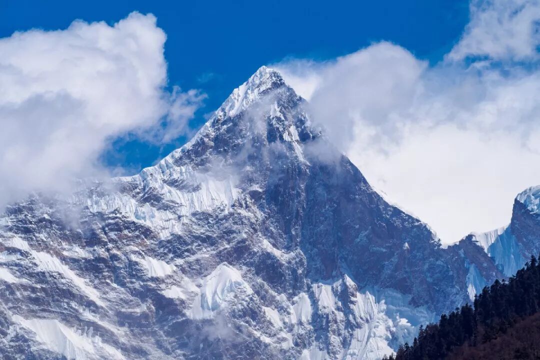 巨大的三角形峰体终年积雪,云雾缭绕,从不轻易露出真面目,传说十人九不遇。