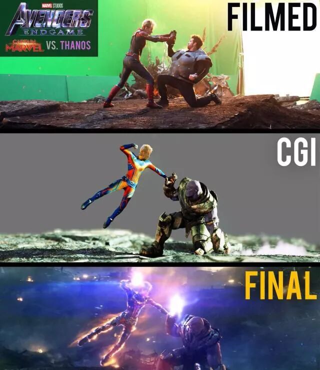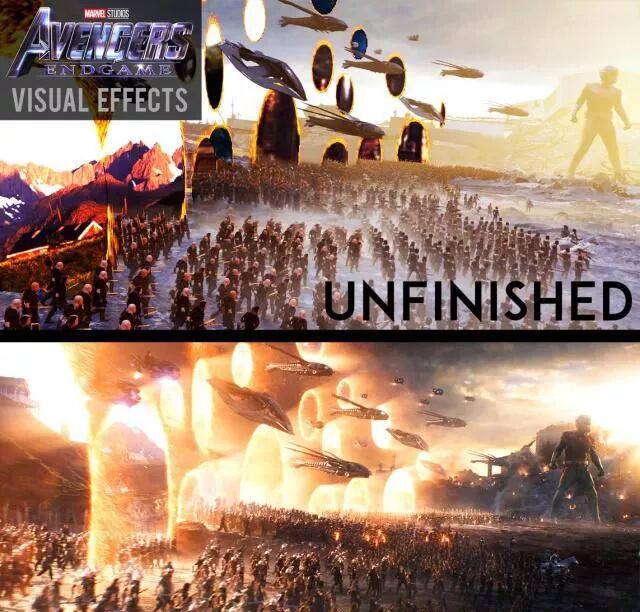 要说《复联4》最费特效的场面,当属结局的那场大战。这场旷世之战的大部分画面都需要经过后期特效处理。上图是美队、钢铁侠、雷神三个人倒下之后,复仇者联盟其他成员前来支援的超燃画面。可以看出,在特效处理一半时,整个画面看起来并不自然,看起来像“动画片”,而经过特效渲染之后的场面,看起来就真实得多了。