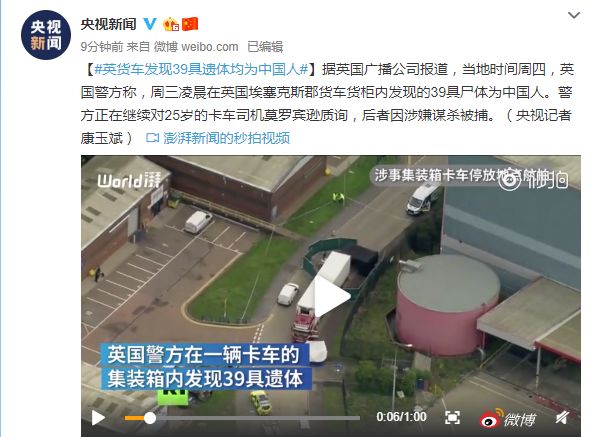 报道称,英国警方10月23日凌晨接报赶往现场,在园区内一辆白色货柜车车厢内发现39具尸体。