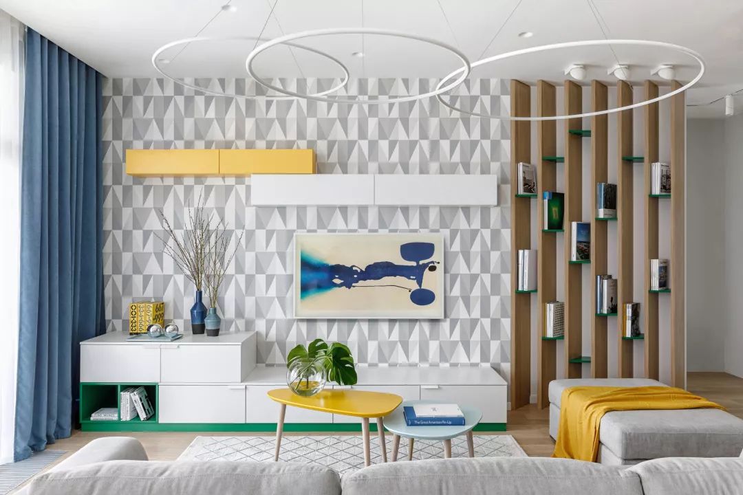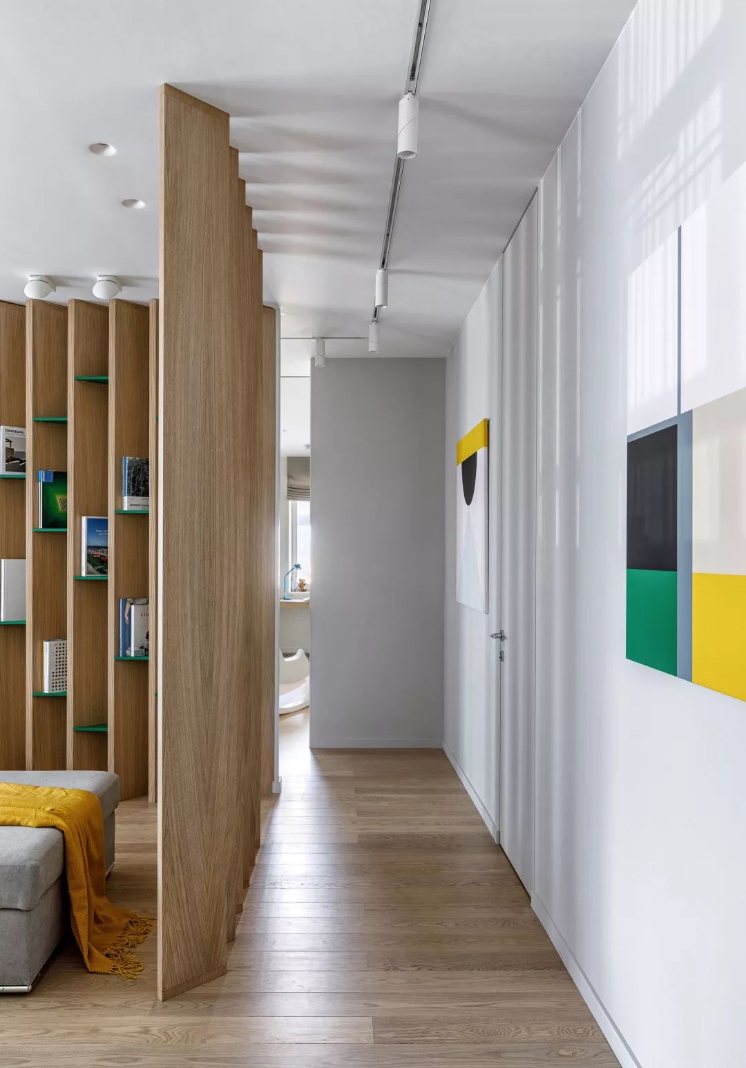 设计师伊凡·波兹德尼亚科夫(Ivan Pozdnyakov)设计的内饰充分体现了客户开朗的性格,通过使用颜色+几何的方式塑造了一个明亮开放的空间环境。最初,这间莫斯科的公寓是迷宫般的长长的走廊和小房间。设计师建议将厨房,客厅和走廊合并为一个空间,以使房间在视觉上更大,更明亮。柔软的高级灰色沙发将烹饪区与休息区隔开,点缀上小苍兰黄色和绿长石色的靠包,悬挂代尔夫特蓝色的窗帘,木制薄板环绕走廊,遮盖了浴室的入口。