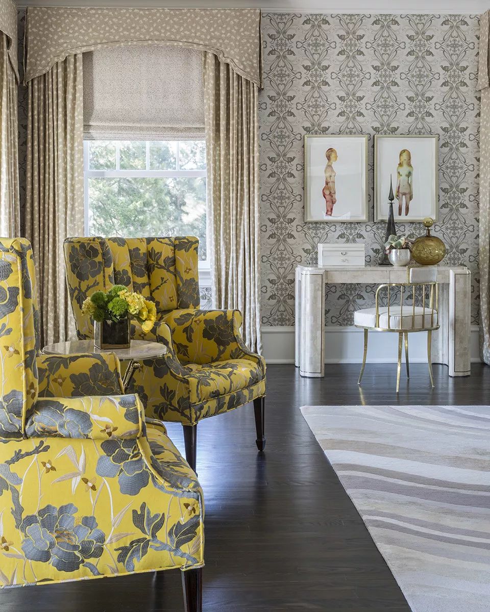 利用灰黄撞色拼接的方式涂刷墙壁来提升空间的格局和视感不失为一处巧妙的设计构思,色彩的选取上不需要太过浓重,也不能太过素淡,平和的银色与粉黄色刚刚好。在优雅的空间内开辟出一处亲和且闲适的交谈区,也在视感上营造出丰富的层次感与格调鲜明的艺术风韵。