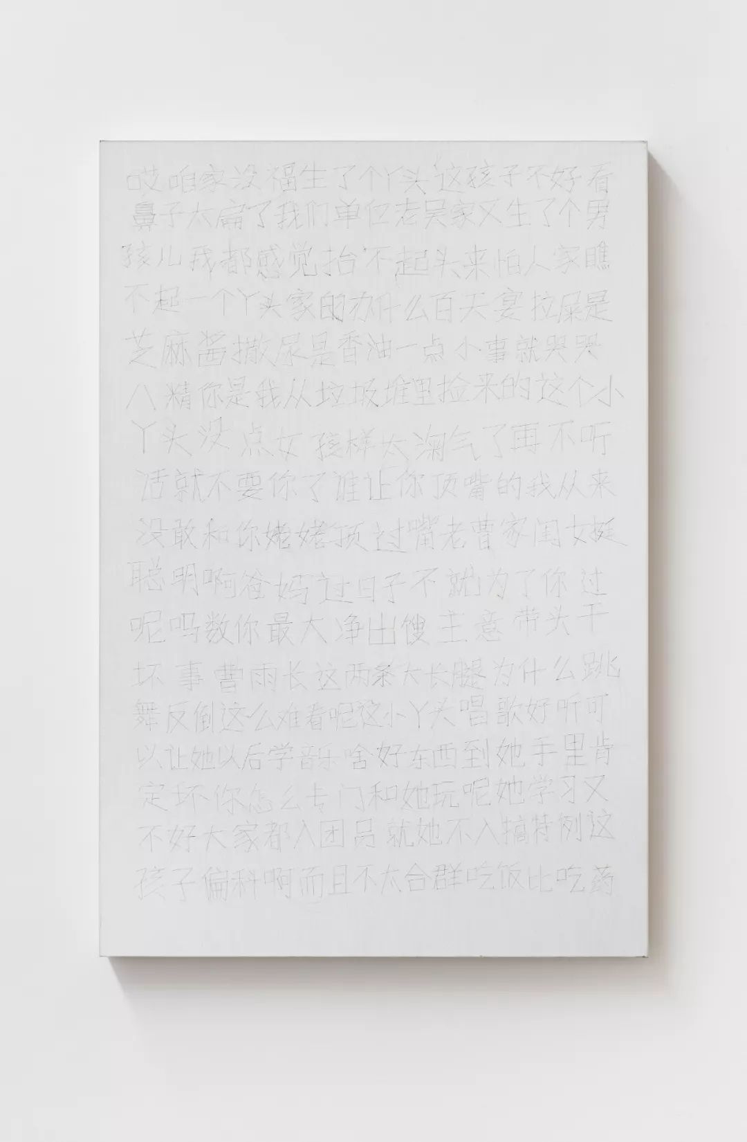 画布上的内容呈现从艺术家出生伊始便开始的来自于他人口中对其的评判。这些普世价值观,被按照成长的时间线索, 伴时间流逝而脱落的长发,以文字形式一笔一划呈现出来。 文字中隐藏了诸如家人或外界对一个女孩的刻薄之词或性别歧视。 如苛责的来源于开篇首句已道明。 文中的“ 曹雨” 们从小家庭关系失衡为起始, 社会的权利结构亦不言自明。柔软发丝化为坚硬画笔, 锋利刀刻般的僵直线条来自于锐利与柔软的较量, 集暴力的出发者与隐忍者为一体。作品如连续剧般延续, 时间不间断流逝, 全文亦没有被标点符号所停顿, 致人在连续阅读至末尾时如众声合鸣。
