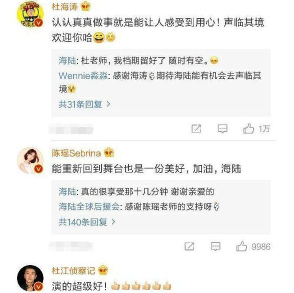 更戏剧的是,海陆的这条微博,获得了大半个演艺圈的支持。 沈腾、薛之谦、陈赫、陈晓、赵丽颖、王晓晨、娄艺潇、陈乔恩…