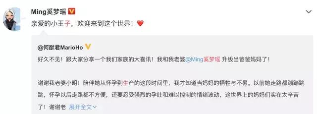 何猷君写下长文,字里行间充满初为人父的喜悦:“好久不见!跟大家分享一个我们家族的大喜讯!我和我老婆升级当爸爸妈妈了!谢谢我老婆小明!”奚梦瑶也转发了老公的长文,用充满慈爱的口吻说:“亲爱的小王子,欢迎来到这个世界!”