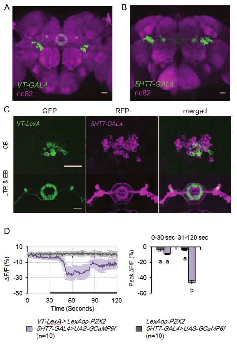 图3. 参与睡眠结构的调控椭球体中两类神经元(R2和5-HT7受体神经元)存在相互作用的突触连接。A:VT-GAL4+神经元在椭球体中的投射区域; B:5-HT7 GAL4+神经元在椭球体中的投射区域; C:VT-LexA+和5-HT7GAL4+神经元胞体投射区域小部分重合; D:VT-LexA+神经元抑制5-HT7 GAL4+神经元。(图片整合于论文Liu et al.2019)