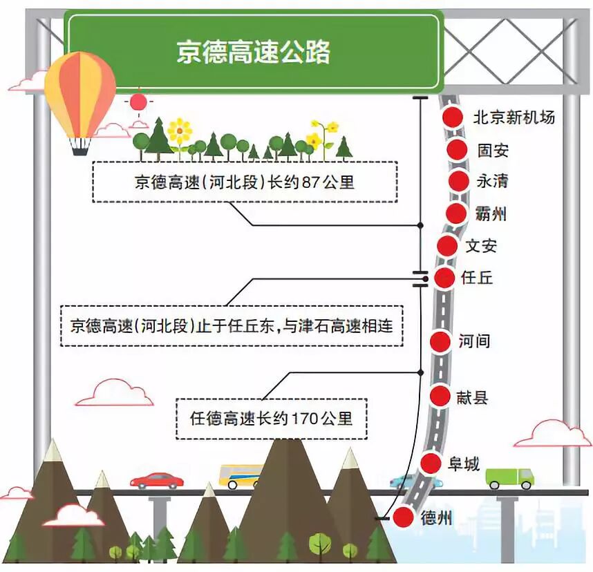 京德高速一期工程,起自廊坊市固安县纪家庄村东的京冀界(永定河),与北京段(机场南北航站楼联络线)顺接,止于任丘市梁召镇南,与津石高速交叉设置枢纽互通,全长87公里,采用双向六车道高速公路标准建设,设计速度120公里/小时,路基宽34.5米,项目估算投资约215亿元,计划于2019年10月底开工建设,2021年底建成通车。