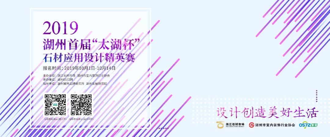为进一步倡导绿色、节能、时尚、安全、环保的室内装饰设计理念,充分展示装饰设计企业和设计师的良好形象,提升和激发设计师的社会影响力和创造创新力,提高装饰设计项目的设计水平,保障施工工程的质量和安全,?全面打造放心消费、绿色装修的装饰设计理念,引导装饰设计行业健康、快速、有序发展。现在湖州地区组织开展“设计创造美好生活”为主题的2019湖州首届“太湖杯”石材应用设计精英赛。本届设计大赛由湖州市室内装饰行业协会联合浙江石材市场共同主办,首次邀请天和设计院杨晓辉院长,天和设计院姚琪所长,湖州品牌研究所赵刚教授,湖州师范学院艺术学院环境设计系主任,湖州发展研究院副所长刘佳妮老师,湖州室内装饰行业协会高余文会长