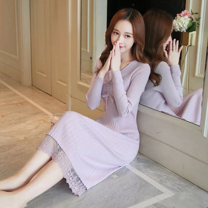 新款毛衣针织裙V领过膝连衣裙拼接蕾丝HT7088